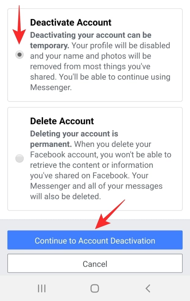 If you would like to continue using Facebook Messenger, make sure you check the box on the next page. Tap ‘Deactivate My Account’ to complete the process.