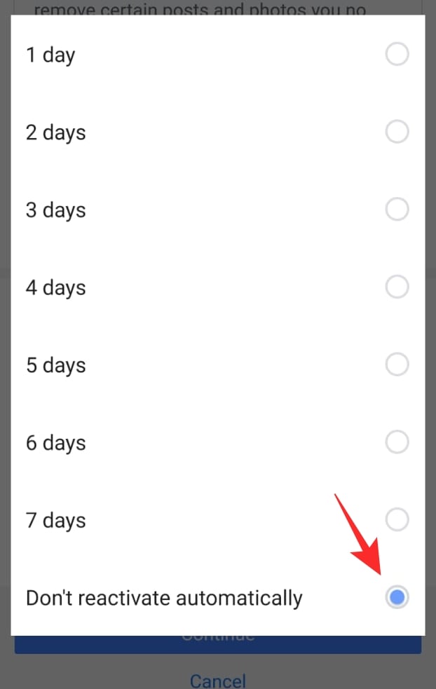 Now, tap the drop-down menu under ‘Reactivating Your Account’ and select ‘Don’t reactivate automatically’. (Don’t worry, you can still reactivate your account easily at any point).