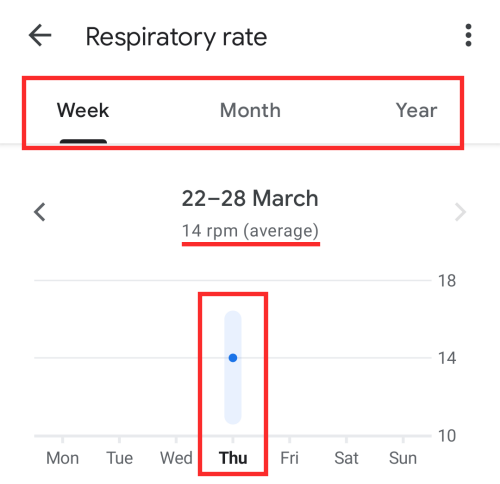 In the next screen, you will be able to see all of your respiratory rate readings from the past. You can look for your respiratory rates from a particular week, month, or year by tapping on the respective tabs at the top.