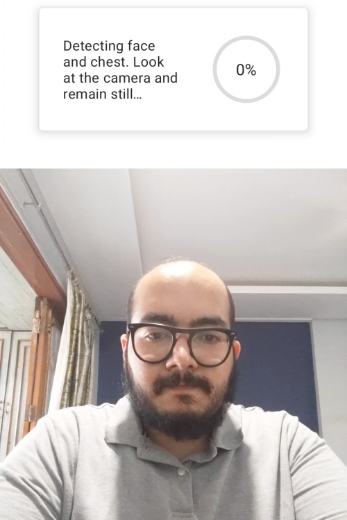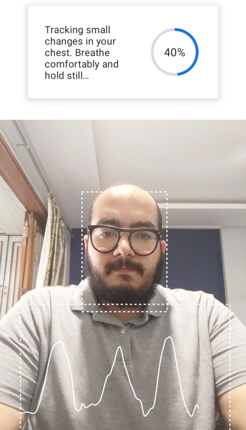 When Google detects you in front of the screen, you should see dotted rectangular borders around your face and chest regions. You will be asked to breathe comfortably.