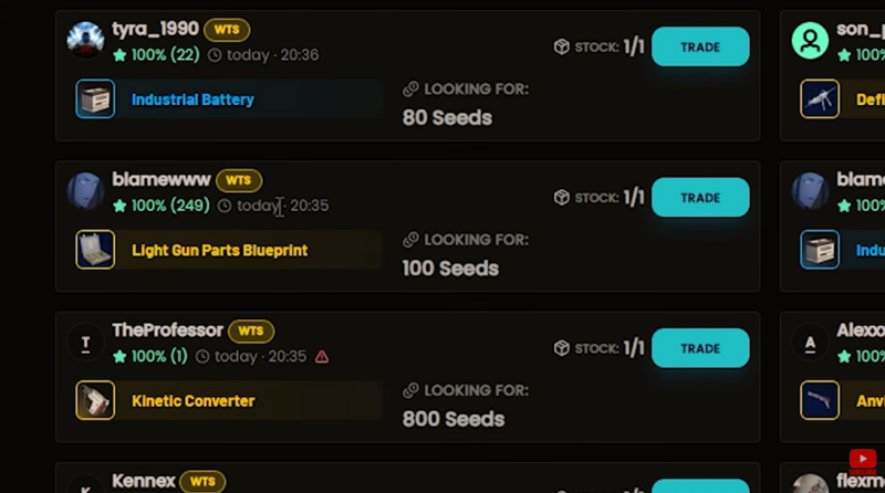 Another trade involved buying a Light Gun Parts blueprint for only about 100 seeds. Considering how long it might take to obtain this blueprint through normal raids, the trade saved hours of farming time.