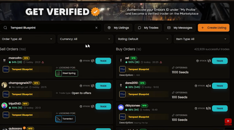 Search for the specific blueprint or equipment you want. Prices are displayed in seeds, allowing you to quickly compare listings.