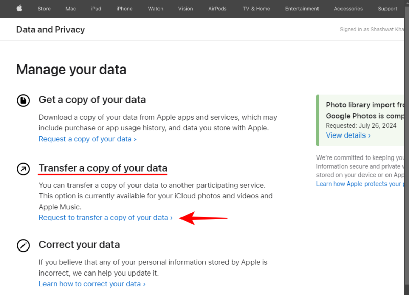 - Under ‘Transfer a copy of your data’, select Request to transfer a copy of your data.