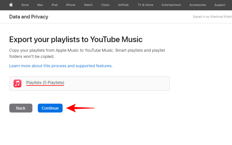 - Go to Apple’s Data and Privacy page, select ‘Request to transfer a copy of your data’, select Apple Music playlists, and follow the on-screen instructions.
