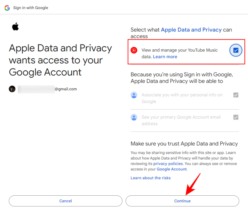 - Make sure to select View and manage your YouTube Music data. Then click Continue.