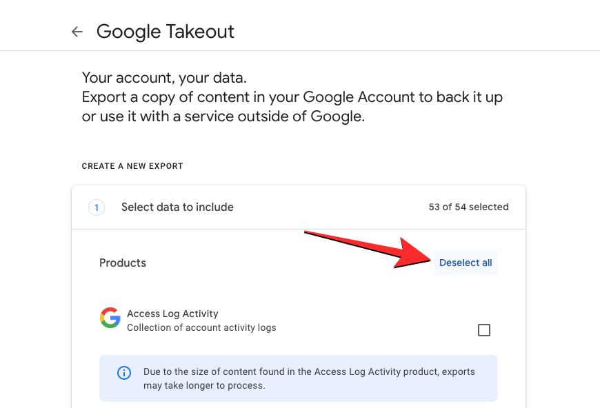 When the Google Takeout page shows up, you will see that some of your Google data has already been selected. Since we’re here to transfer content from your Google Drive from one account to another, click on Deselect all on the page.