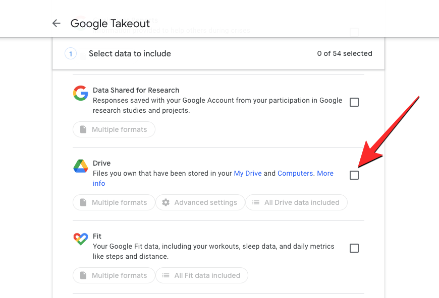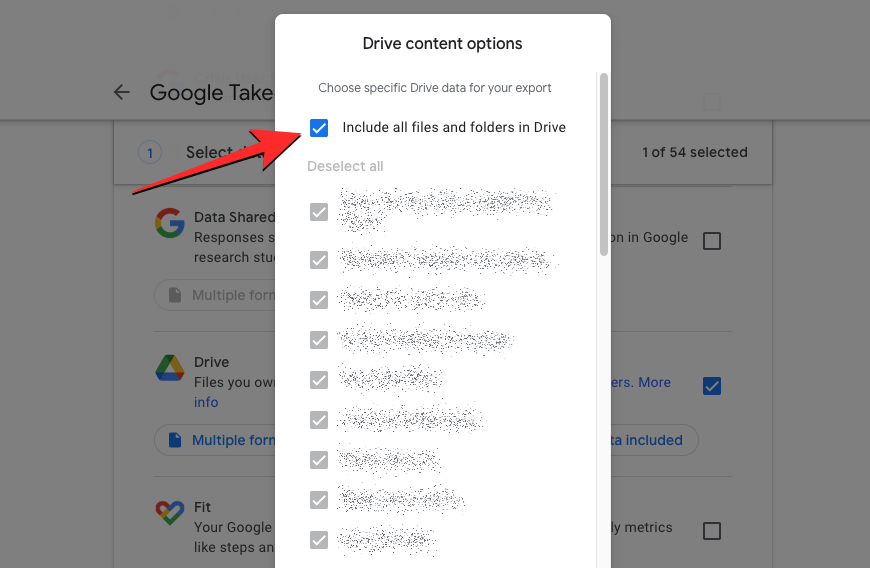 Google will, by default, select all of your Google Drive content for the transfer process. If you wish to copy only a portion of files and folders on Drive, click on the All Drive data included button inside the Drive section.