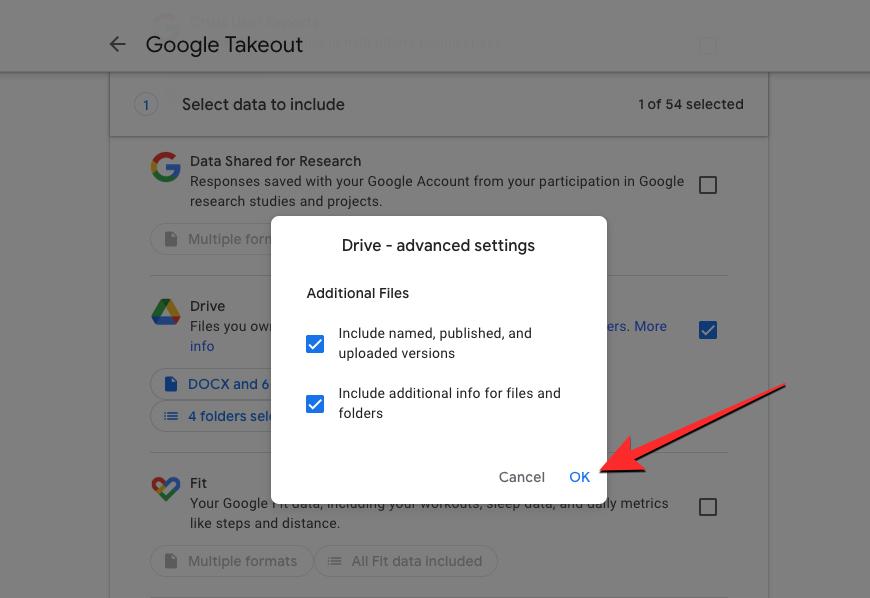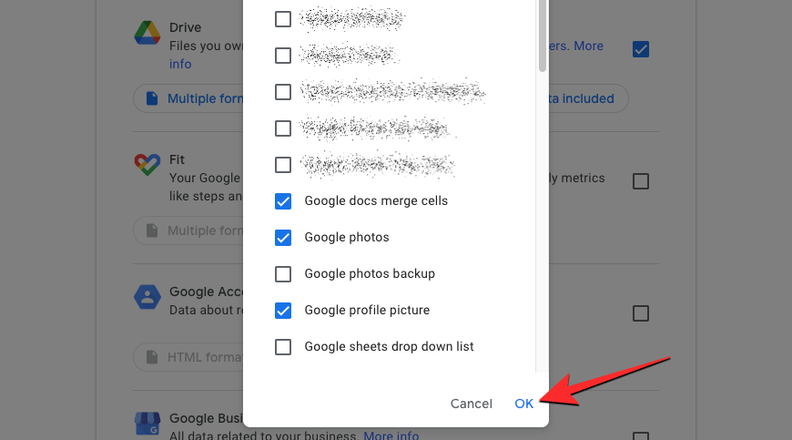 In the overflow box that appears, you’ll see a list of all the formats your data will be saved in for a chosen service. For instance, the default format selected for documents created on Drive is DOCX but you can change it to PDF from this section. Similarly, you can change file types for other files created inside Drive and once you’re done, you can click on OK to proceed.