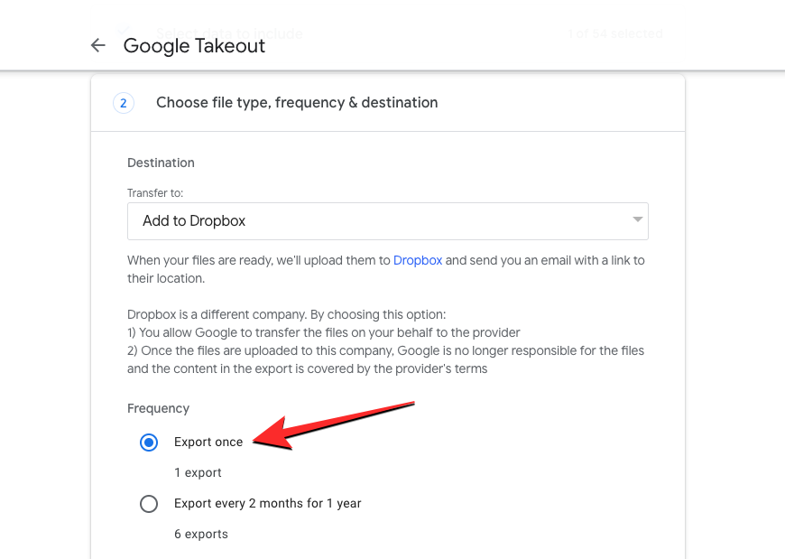 Once you’ve chosen your destination type, choose Export once inside the Frequency section. This will ensure that your Drive’s contents are transferred only once and not repeated.