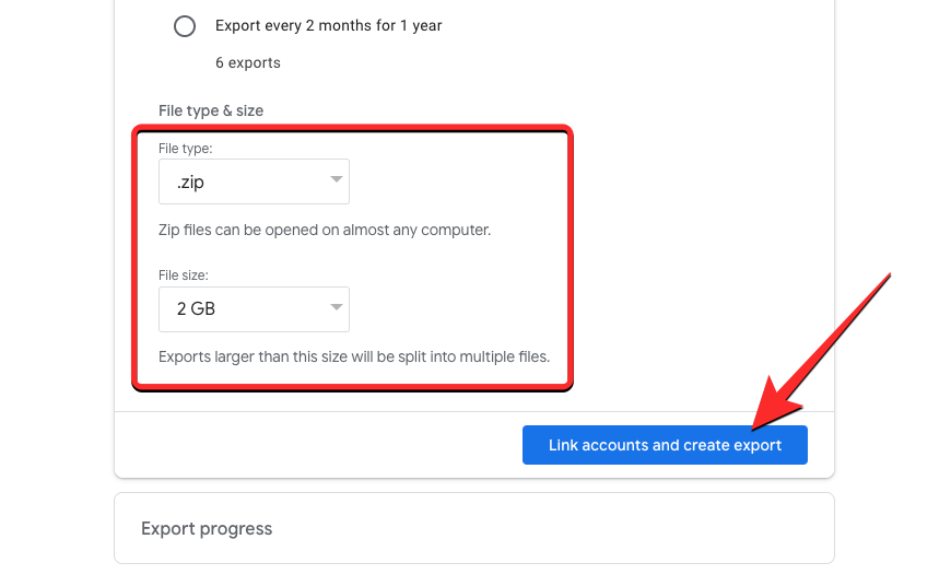 You can choose your preferred file type and size for the transfer from this page. Once all set, click on Link accounts and create export