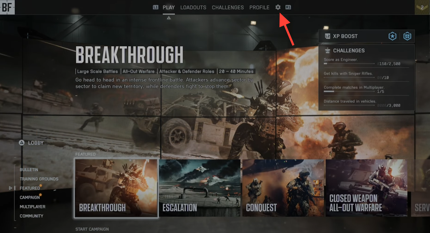Launch Battlefield 6 and on the main menu, click the Settings icon (a gear icon at the top).