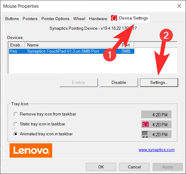 Now, a Mouse properties window will open. Go to the Device Settings tab and click on Settings.