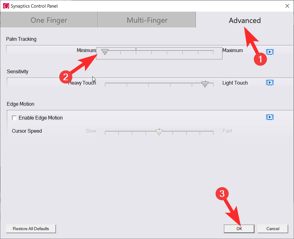 In the Settings menu, go to the Advanced tab and start adjusting the Palm Tracking sensitivity. Drag the cursor to the minimum level. Once you’ve done so, click on OK.