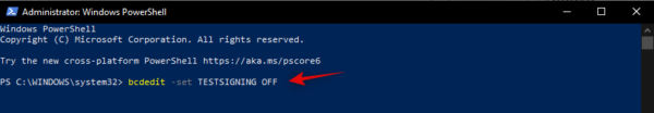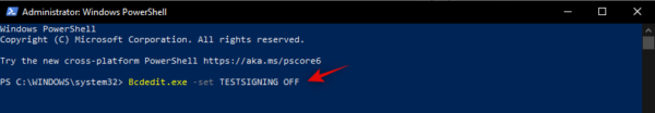 bcdedit -set TESTSIGNING OFF