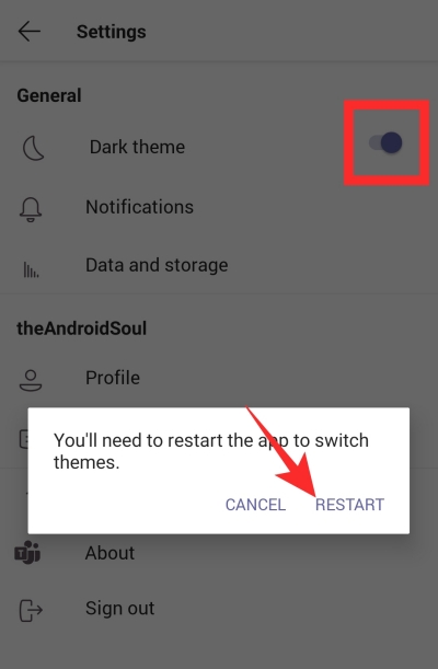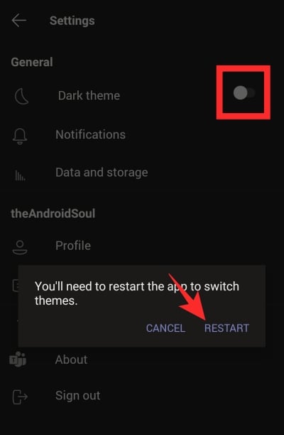Enable it and tap on ‘Restart’ when the prompt asks to restart the app. When it boots up, the Teams app will be in Dark mode.