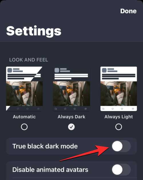 Inside the Settings screen, turn on the True black dark mode toggle on iOS or the True black mode toggle on Android.