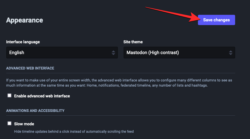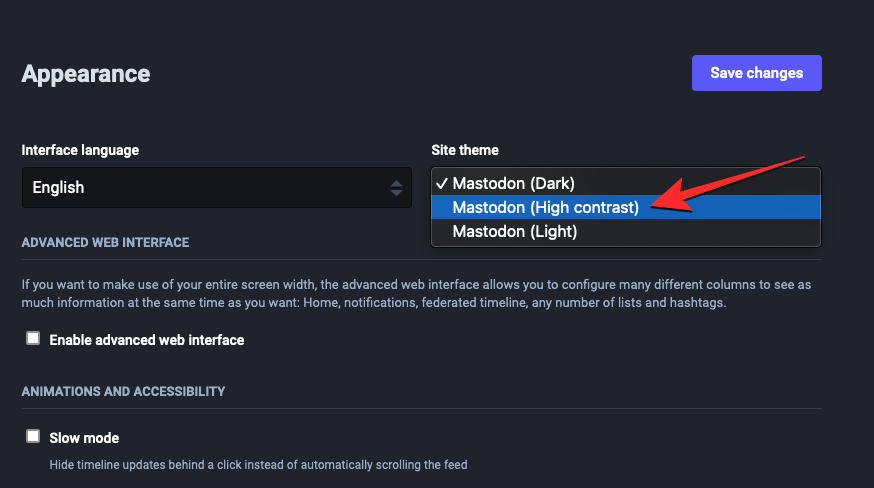 Unlike on the app, Mastodon’s web client switches to an all-black theme when dark mode is enabled on it. You can, however, make this Dark theme even more prominent by switching the theme to High contrast mode as this changes the text’s color to bright white instead of a lighter shade of grey.