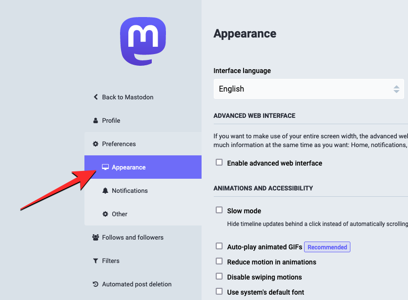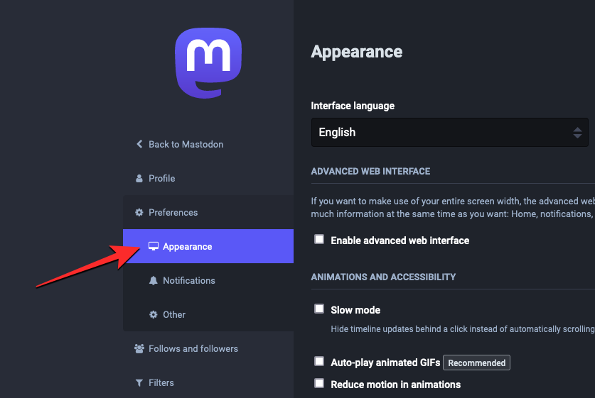 This will open the Settings screen inside Mastodon. To switch to Dark mode permanently, choose Always Dark under the “Look and Feel” section.