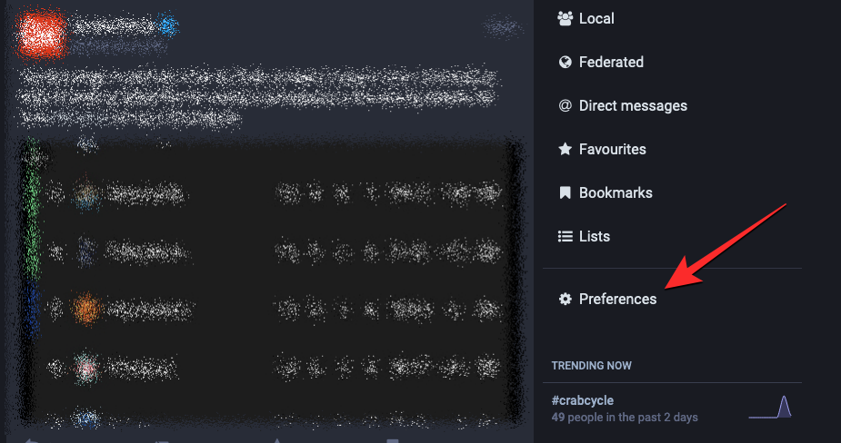 To turn on Dark mode on Mastodon’s web client, open your Mastodon instance on a web browser. When your instance opens, click on the Preferences tab on the right sidebar.