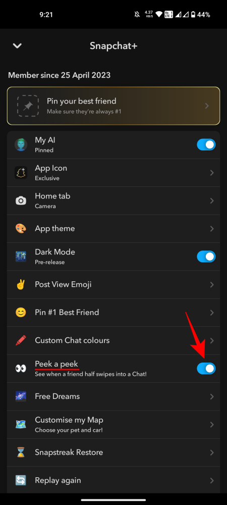 Peek a Peek is a premium feature that is only available to Snapchat+ members. So before you can enable it, you’ll have to have a Snapchat+ subscription.