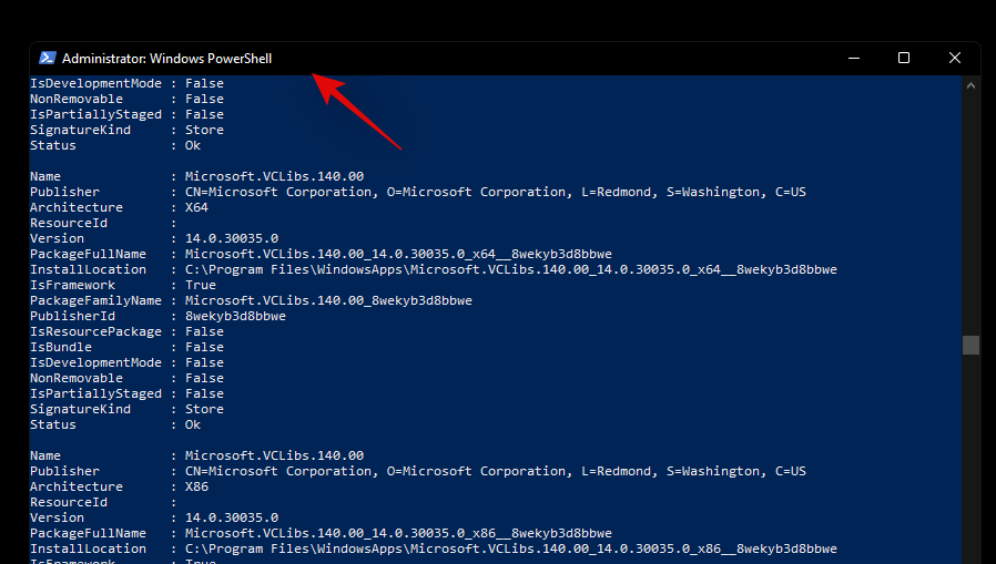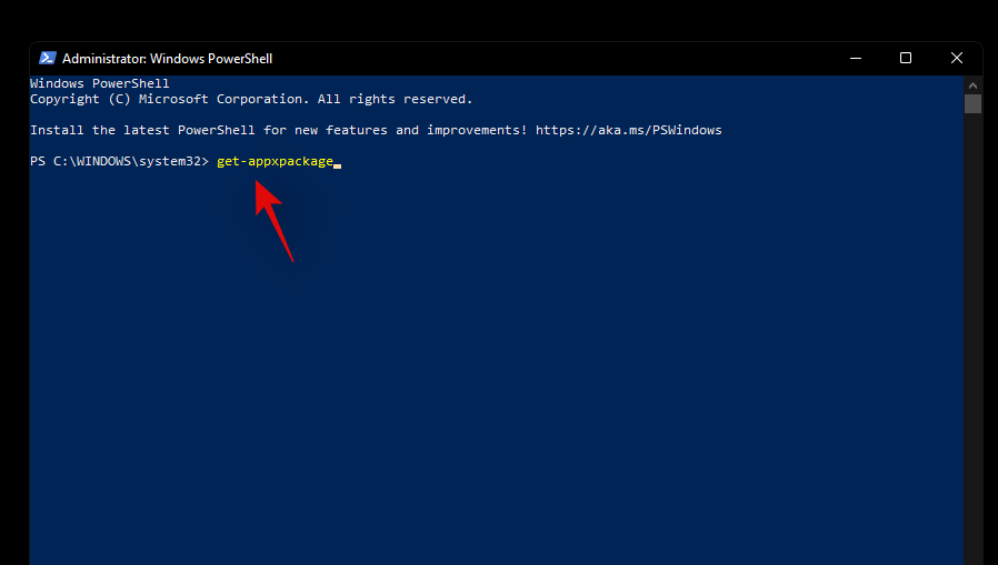 Open an elevated PowerShell using the guide above. If you already have one open on your screen, then start by typing in the following command. Ensure that you replace ‘[PackageName]’ with the full package name of the app we sourced above.