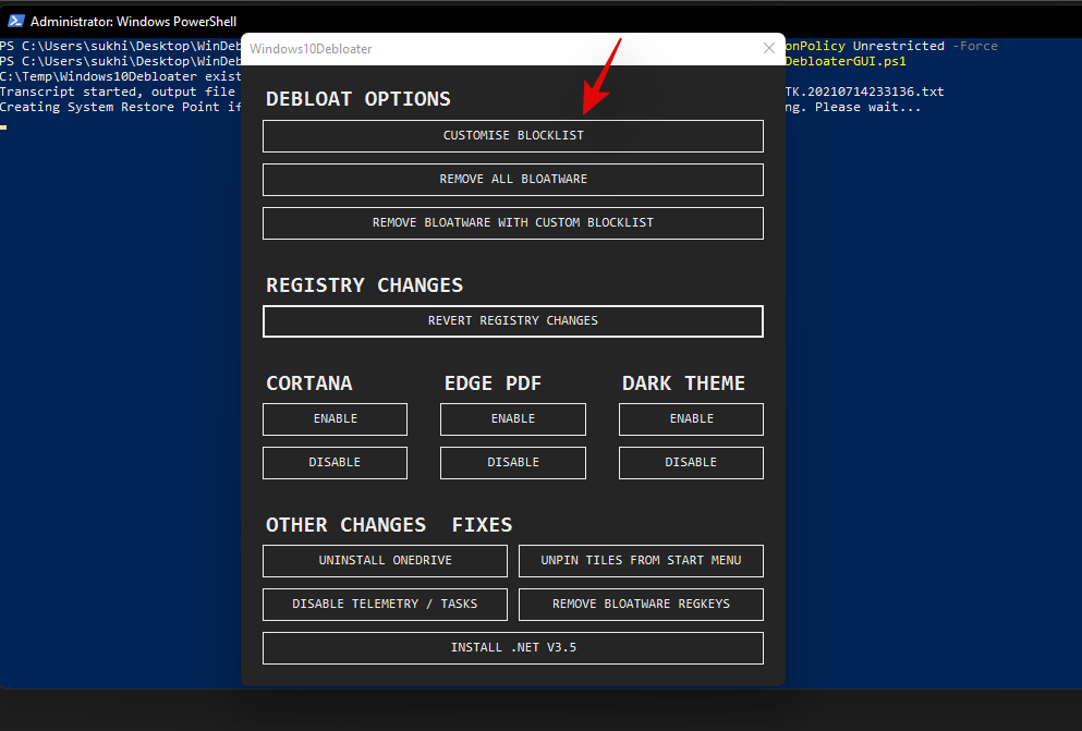 8. This will execute the debloat script and you should now get a graphical interface for it on your screen. Click on ‘Customize Blacklist’ at the top.