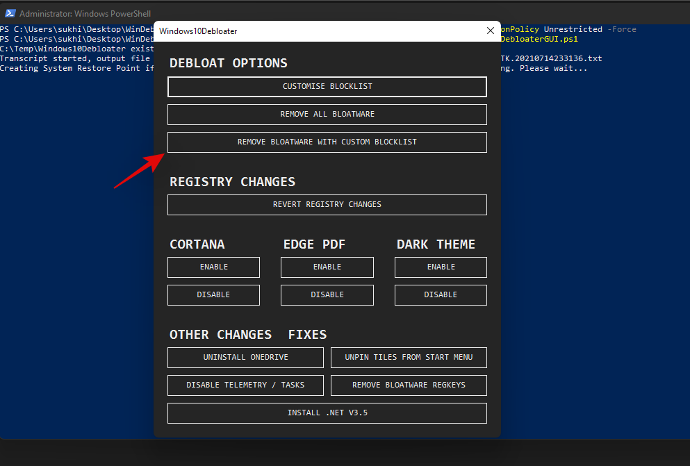 11. Now click on ‘Remove Bloatware with Customized Blacklist’. Keep an eye on the PowerShell window on the background once the command executes.