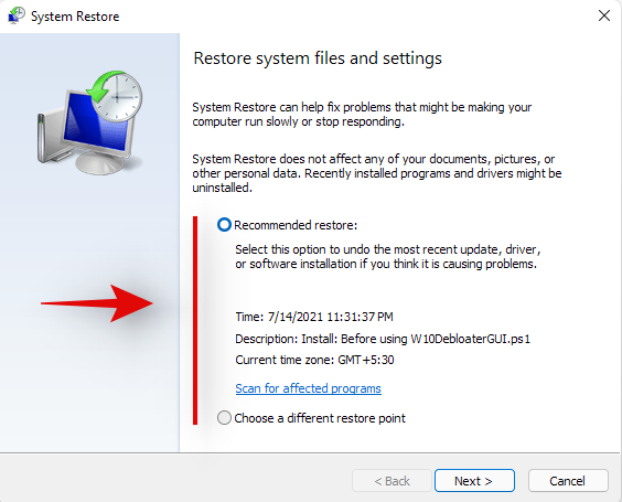 3. You will now be suggested a recent system restore point if you have one. Select that if needed, or click on ‘Choose a different restore point’ if you wish to choose an older one.