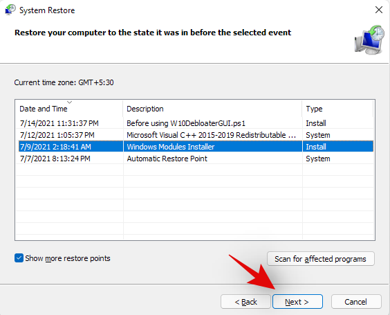 5. You can now select the desired Restore Point from the list at the top. You can check the box for ‘Show more restore points’ if you wish to look at more restore points.