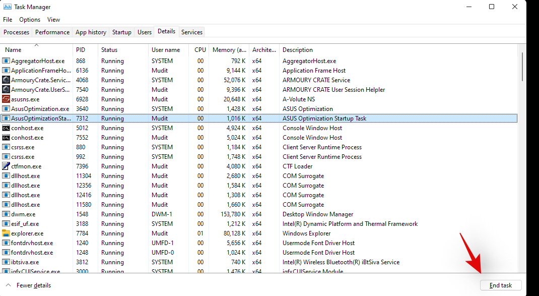 2. Now look for a process in the list for the concerned app. In our case, we are looking to uninstall ‘AsusOptimization’, hence we will look for a PowerToys process. Once found, click and select the process.