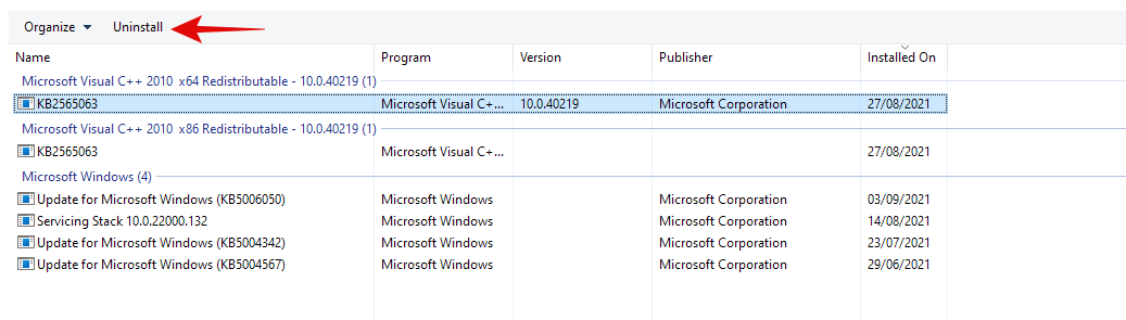 Select the update you wish to remove and click on ‘Uninstall’ at the top.