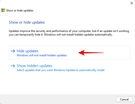 Ensure that ‘Hide updates’ is selected and click on ‘Next’.