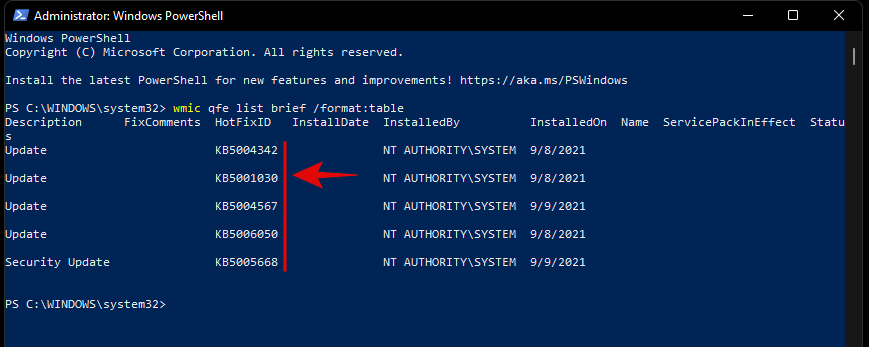 Once done, type in the command below and execute it. Replace ‘NUMBER’ with the KB number you noted down earlier.