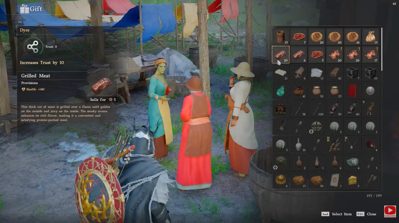 The core mechanic behind this farming method is building trust with dyers using cooked meat. Each dyer responds positively when you gift them 10 pieces of cooked meat, increasing their trust level.