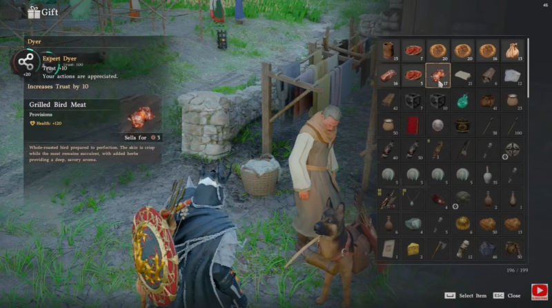 - Gifting cooked meat increases trust and rewards random dyes.