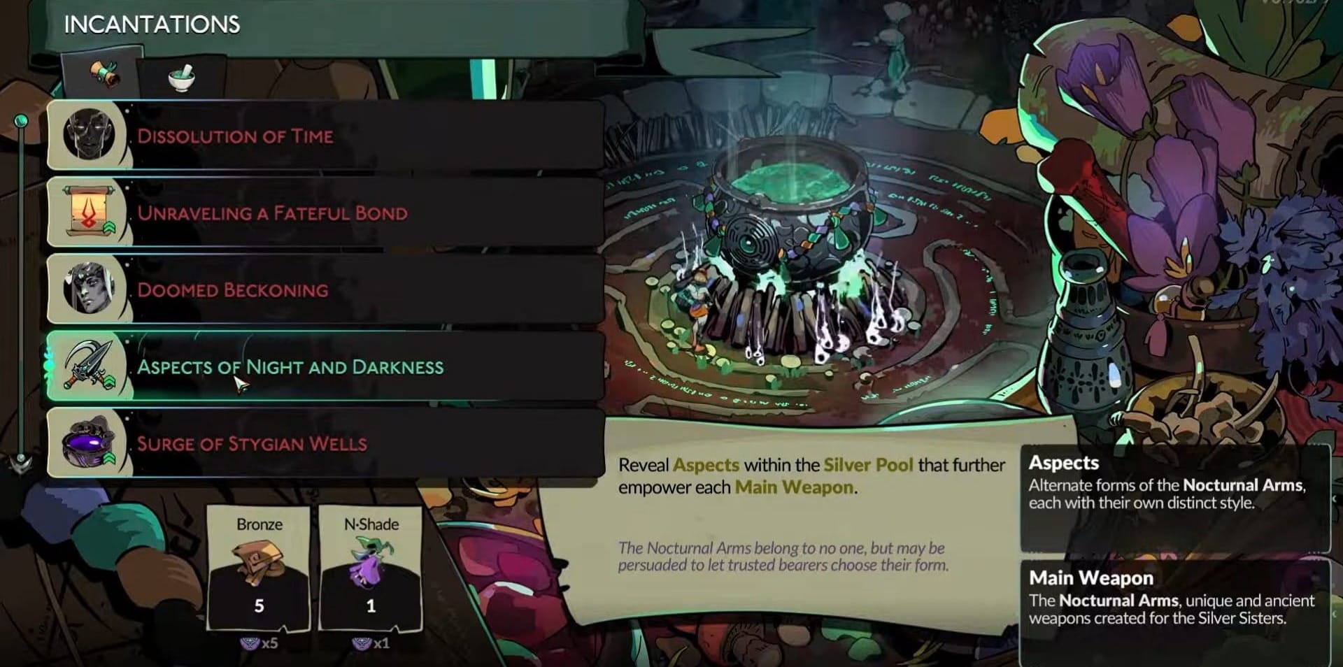 After completing the Hecate runs, check the Crossroads Cauldron for a new recipe named “Aspects of Night and Darkness.” Cast it by paying the required ingredients (commonly five Bronze + one Nightshade). This enables the Aspects interface in the Silver Pool.
