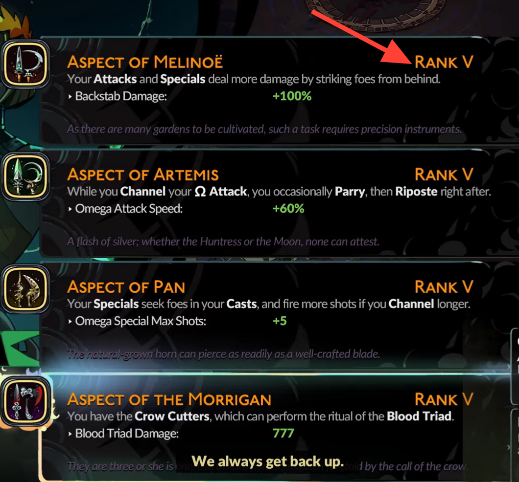 You select an Aspect before each run, swapping freely to experiment—pair the Staff of Momus with healing boons from Demeter for endless pushes.