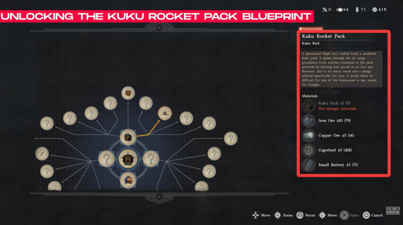 - Crafting requires both base gear (Kuku Pack) and multiple materials.
