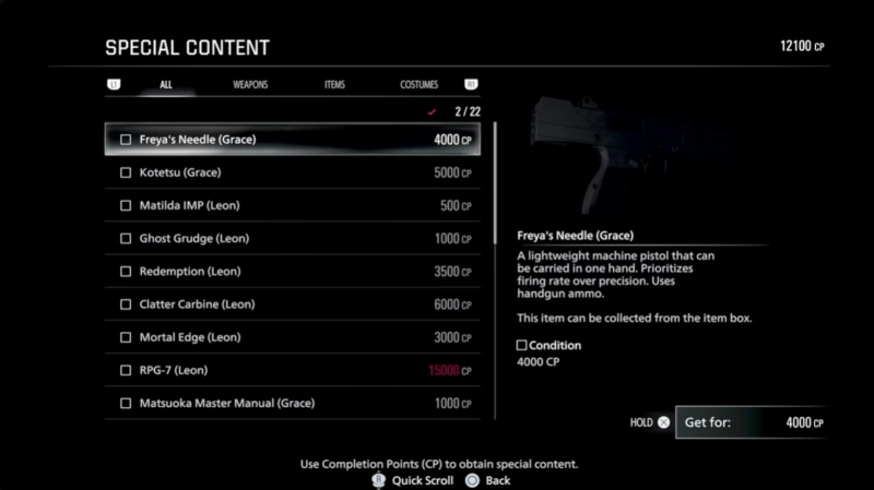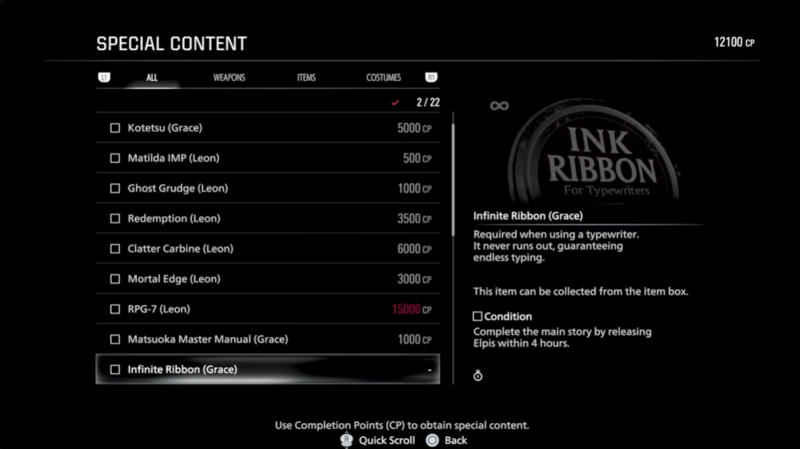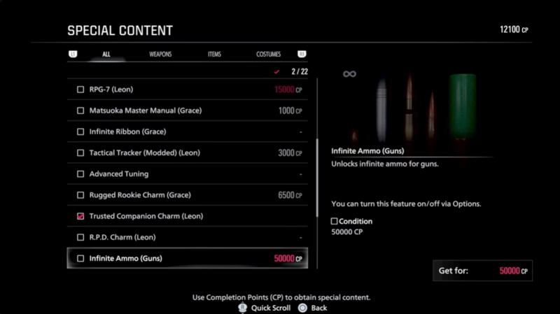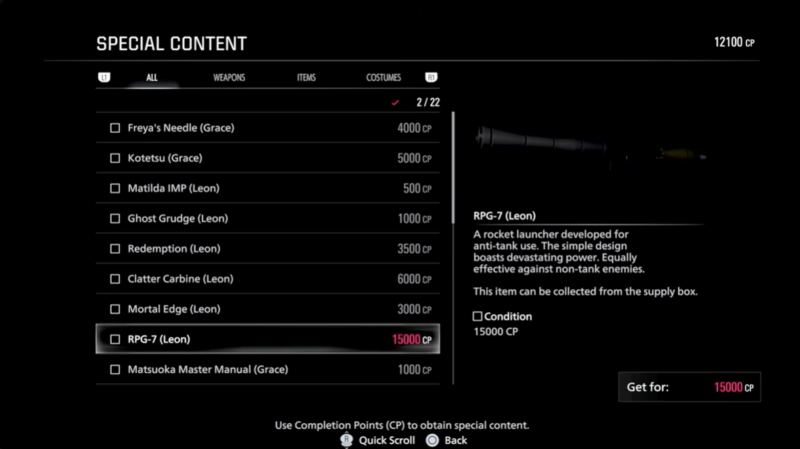 There is also a purchasable RPG7 for Leon costing 15,000 CP, which is not infinite by default unless paired with the infinite ammo unlock. The Infinite RPG is distinct and does not require additional tuning.