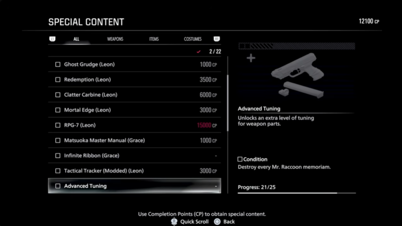 Destroying all 25 Mr. Raccoon memoriam statues unlocks Advanced Tuning, which enables an extra level of weapon enhancement beyond the normal cap.