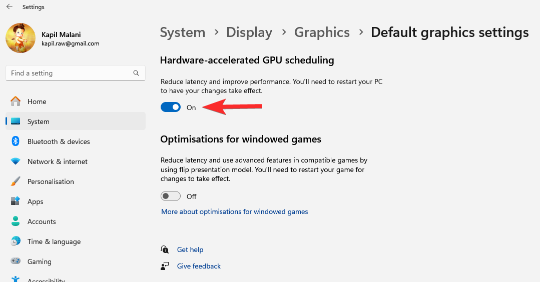 On Windows 11, turn on Hardware-Accelerated GPU Scheduling. Go to Settings → System → Display → Graphics → Default/Advanced graphics settings. Turn on Hardware-Accelerated GPU Scheduling and reboot your PC thereafter.
