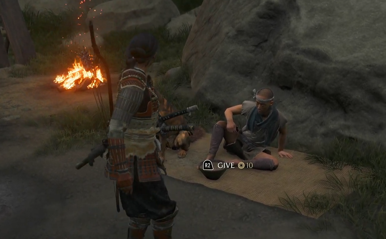 Approach the gate to Ishikari Plain and speak with the beggar standing nearby. Show willingness to provide coin, which prompts the beggar to hint at needing a travel permit.