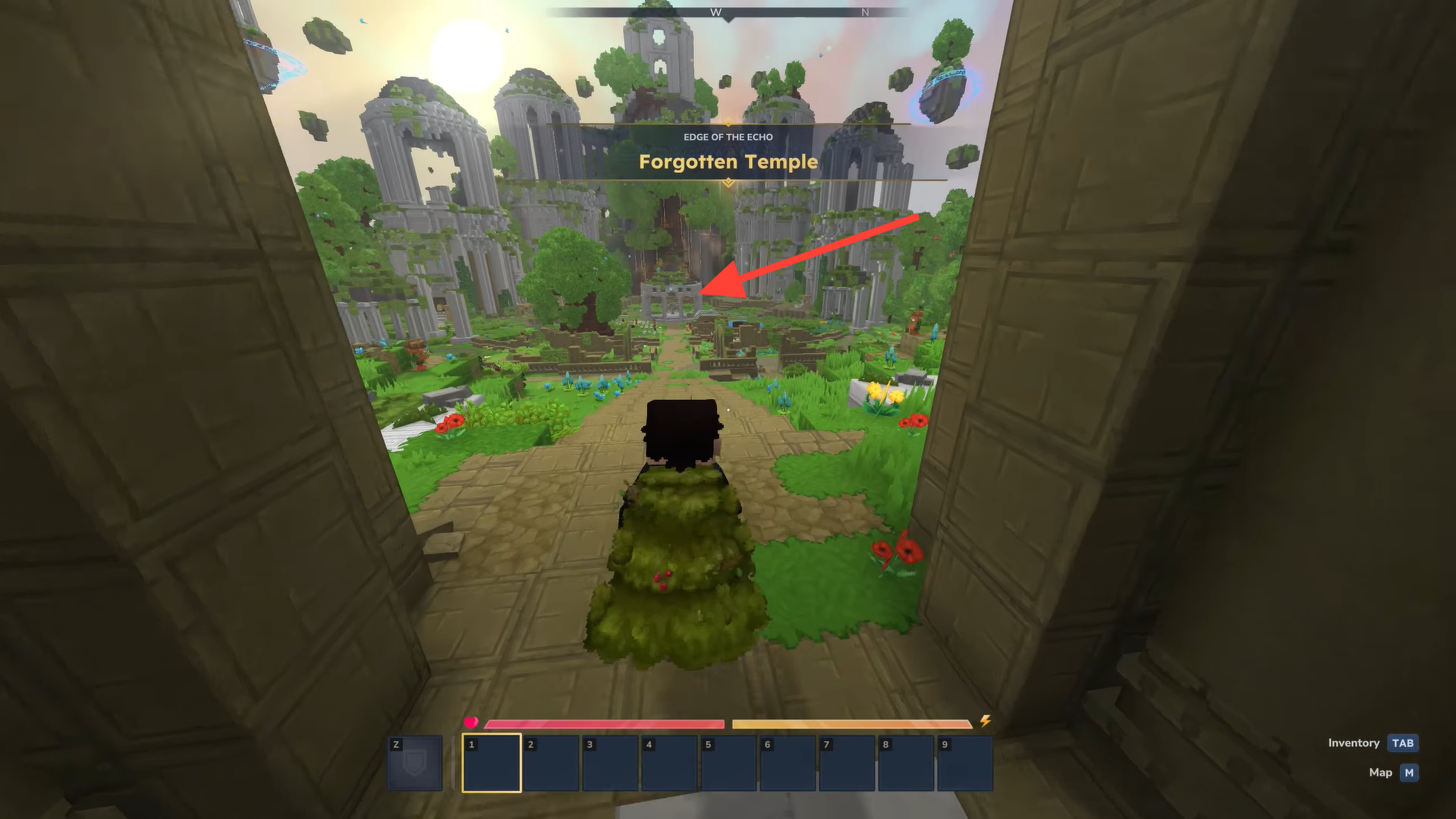 The Forgotten Temple is always fairly close to your spawn point, but its exact position changes with each world seed. The easiest way to find it is to look at the navigation bar at the top of your screen, which shows important waypoints like your bed and death markers.