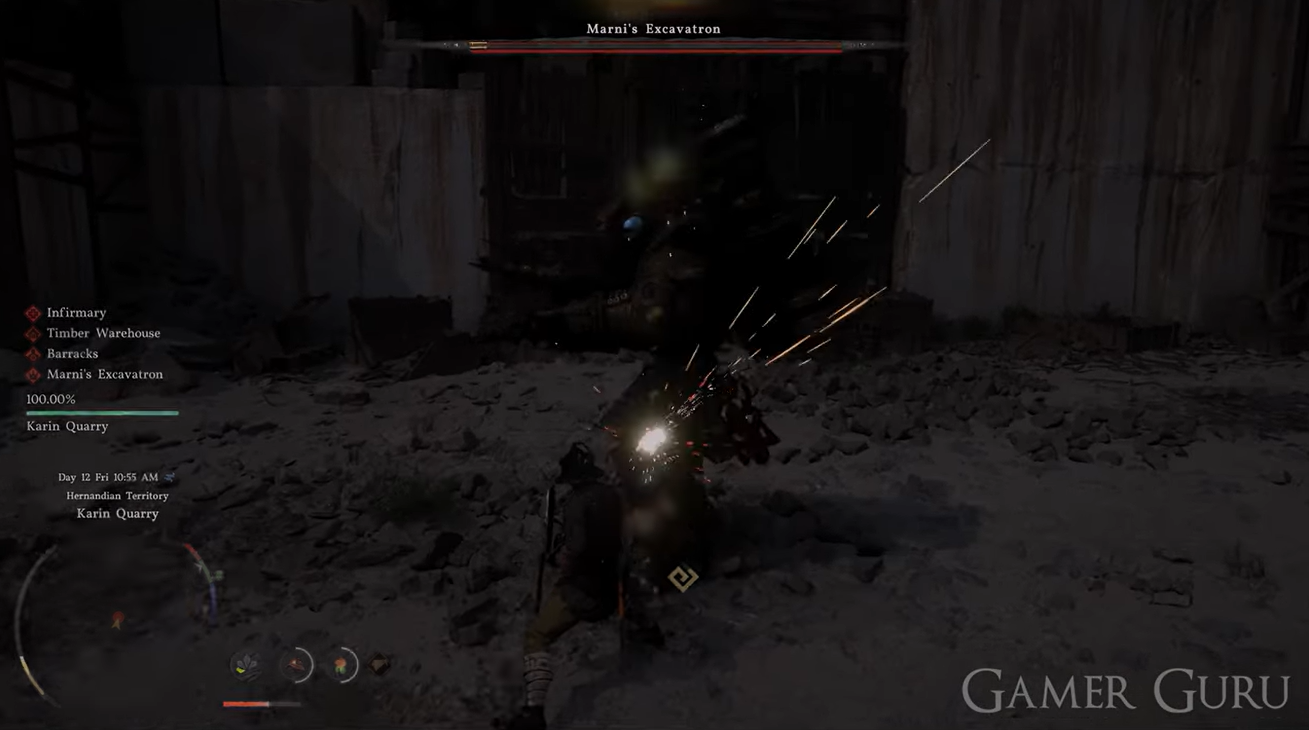At the quarry, you will face the boss known as Marni’s Excavatron. This enemy uses mechanical attacks and can deal moderate damage, especially if you’re under-leveled.