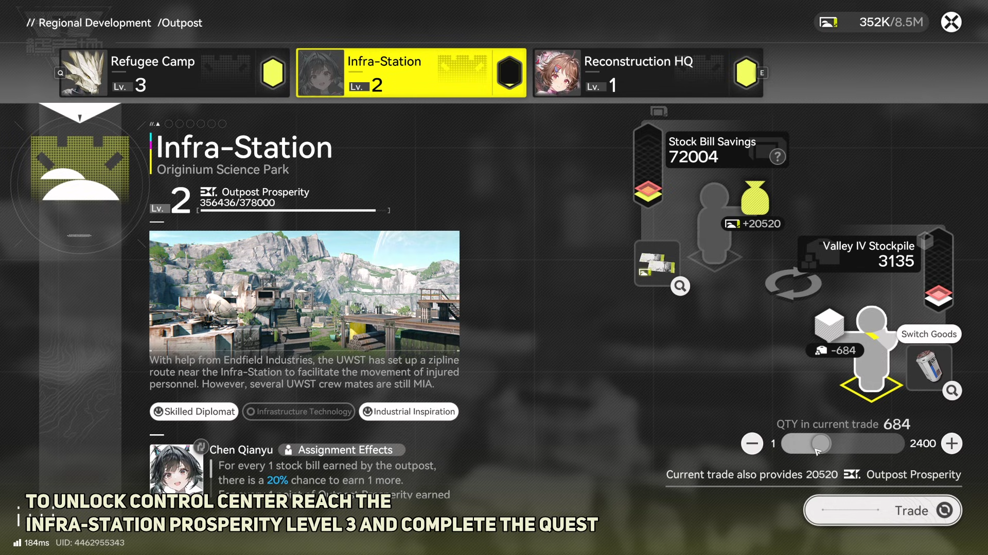 If the Control Center is still locked, the most likely cause is OD Project “Infra” Level 2 not being completed yet (even if other side activities in the zone are done). If the Infra-Station outpost isn’t unlocked/active, complete the Infra-Tower Outpost quest first because it enables the regional power and facility progression that the chain depends on. If progression seems stalled, focus on the local infrastructure/prosperity-linked mission steps around the Infra-Station until the OD Project level requirements advance.