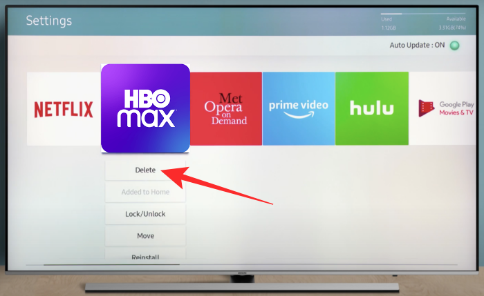 You will now be able to see the HBO Max app on this screen. Press the Down button or Tools button on your remote and then select the ‘Delete’ option.
