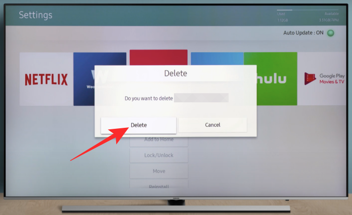 Your TV will now prompt you whether you want to remove the app. Select the ‘Delete’ option to confirm the process.