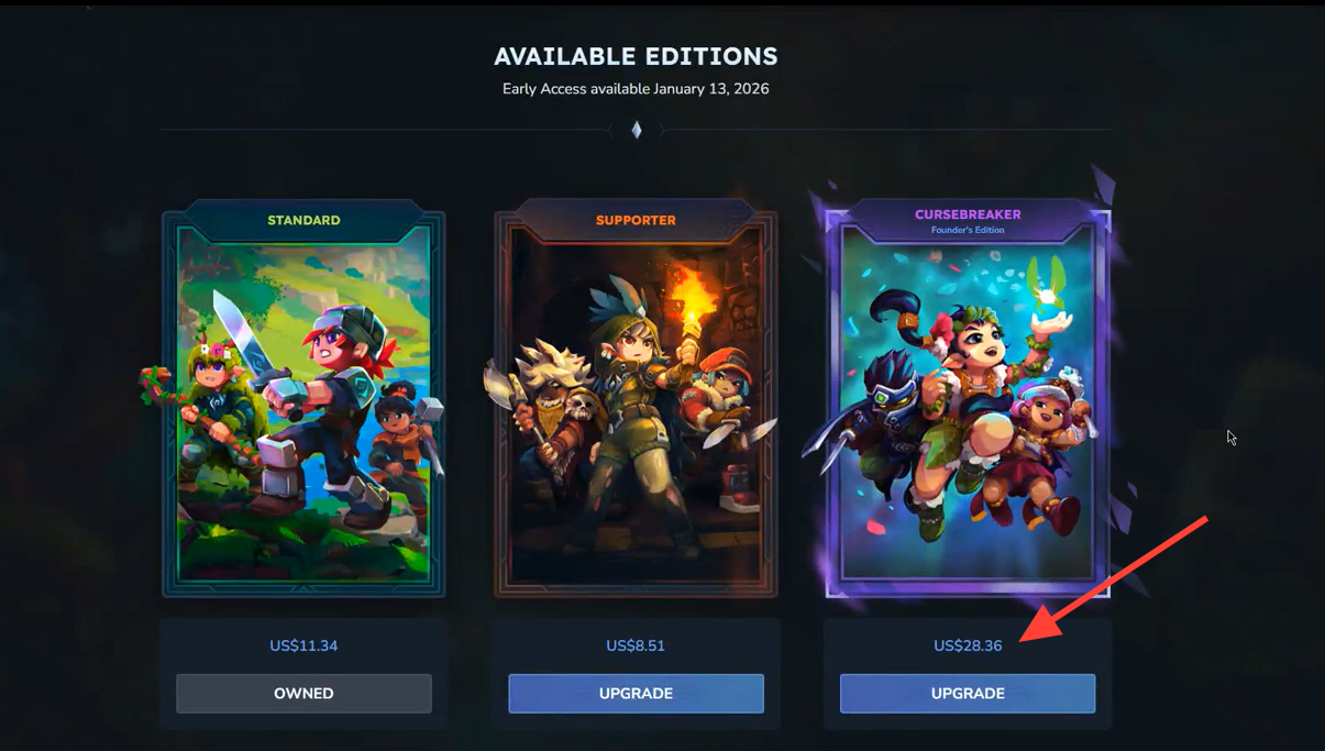 First, you buy your initial edition by purchasing either the Standard, Supporter, or Cursebreaker version. Later, if you decide you want a higher-tier edition, you can choose to upgrade at any time. When upgrading, you only need to pay the price difference between the editions rather than the full cost again. Once the payment is complete, the new edition’s cosmetics unlock automatically in your account.