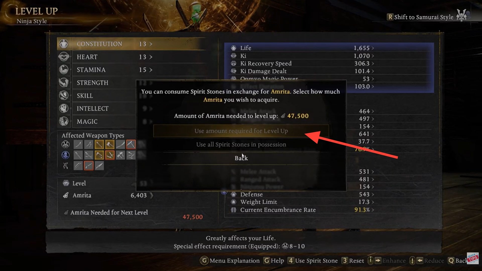 - Choose “Use amount required for Level Up” or “Use all Spirit Stones in possession.”
