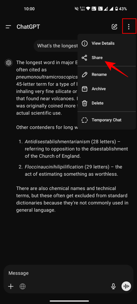 You can share a link to your chat with others as well. Tap on the three-dot icon in the top right corner and select Share.